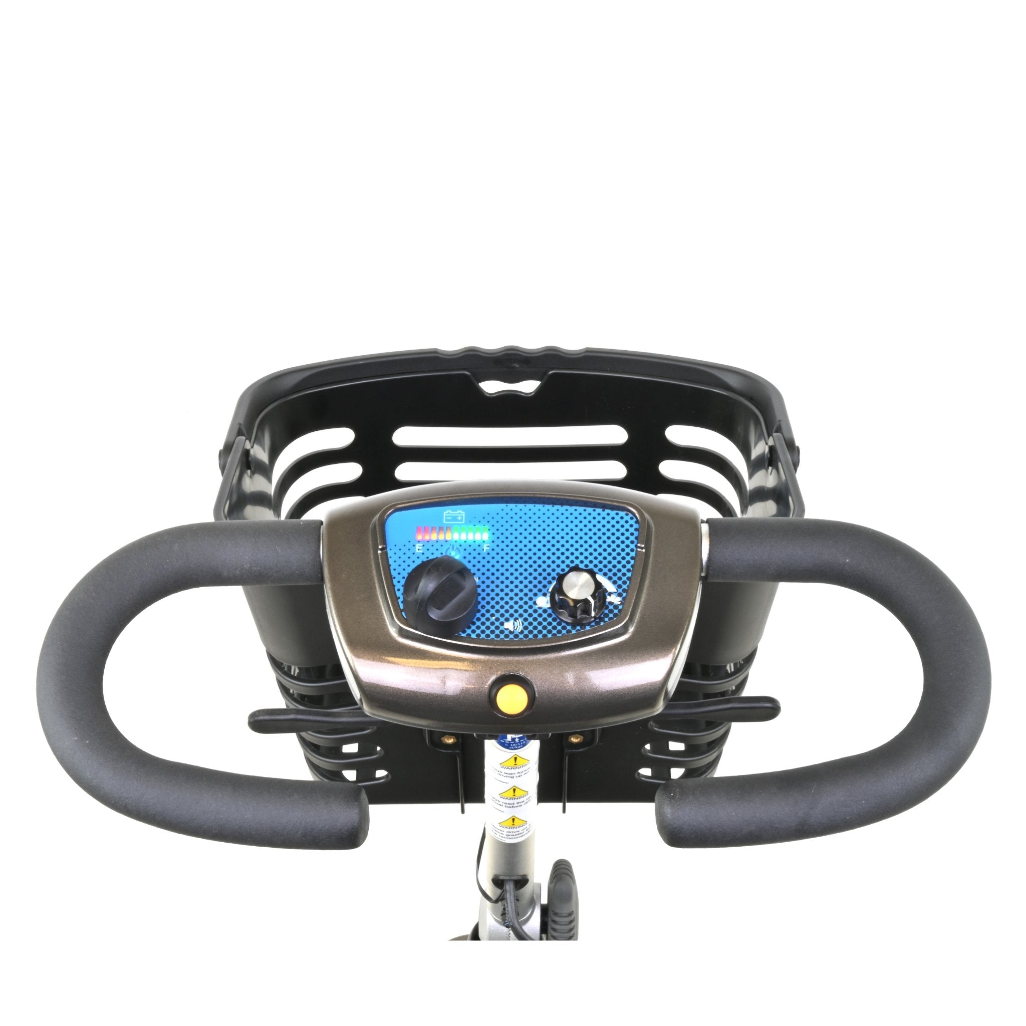 Forget the bumpy ride of standard travel scooters. The Illusion features advanced engineered adjustable front and rear suspension that works with its durable, puncture-proof tyres to deliver a fantastically enjoyable driving experience over varied terrains. The comfortable and spacious deep foam covered seat and the shallow floor plate—which provides exceptional legroom even for taller users—further enhance all-day comfort.