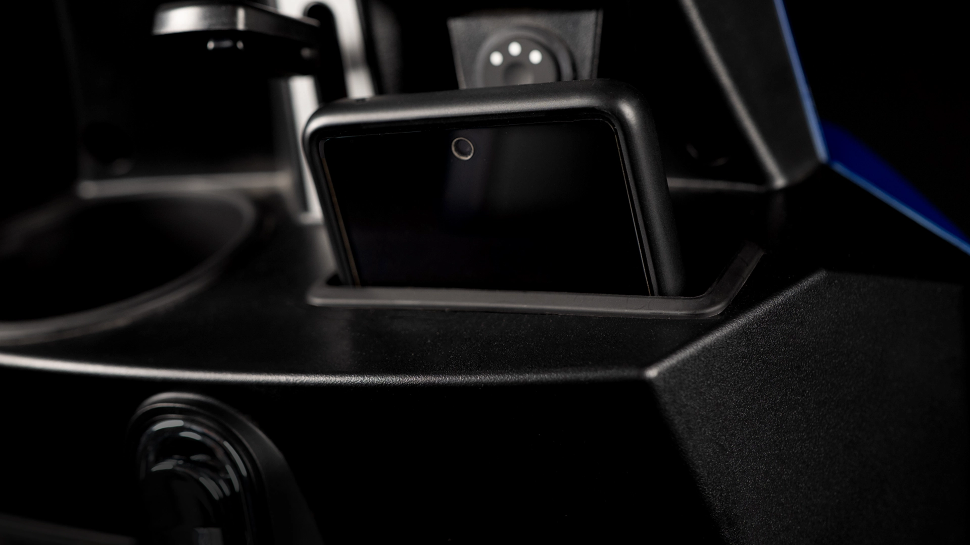Integrated Bluetooth connectivity pairs with smartphones for wireless music streaming through upgraded speaker system. Quality speakers deliver clear audio reproduction for entertainment during travel. Built-in microphone positioned in the tiller enables crystal-clear hands-free communication, allowing phone conversations without handling devices. Dedicated mobile phone holder with extra-deep design securely stores phones within easy view for navigation, communication, or music control.