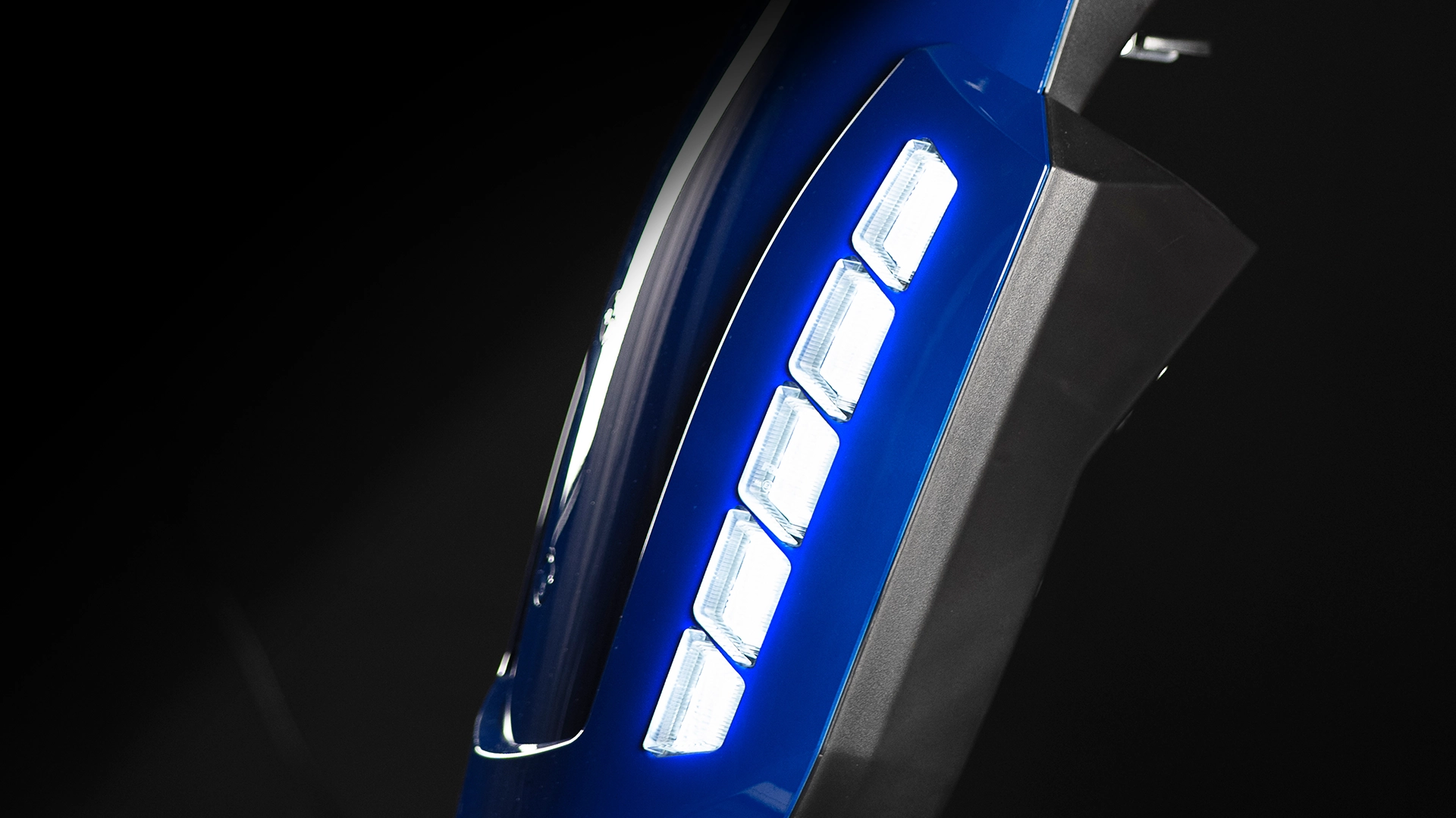 Daylight running lights provide continuous illumination during daytime operation, enhancing visibility to other road users in all lighting conditions. Sweeping indicator lights create dynamic visual signals for improved communication with traffic. Dazzling LED lighting system features energy-efficient front and rear lights designed for long life and superior brightness, even in cold conditions. Full LED configuration includes headlights, tail lights, brake lights, and indicators for comprehensive visibility.