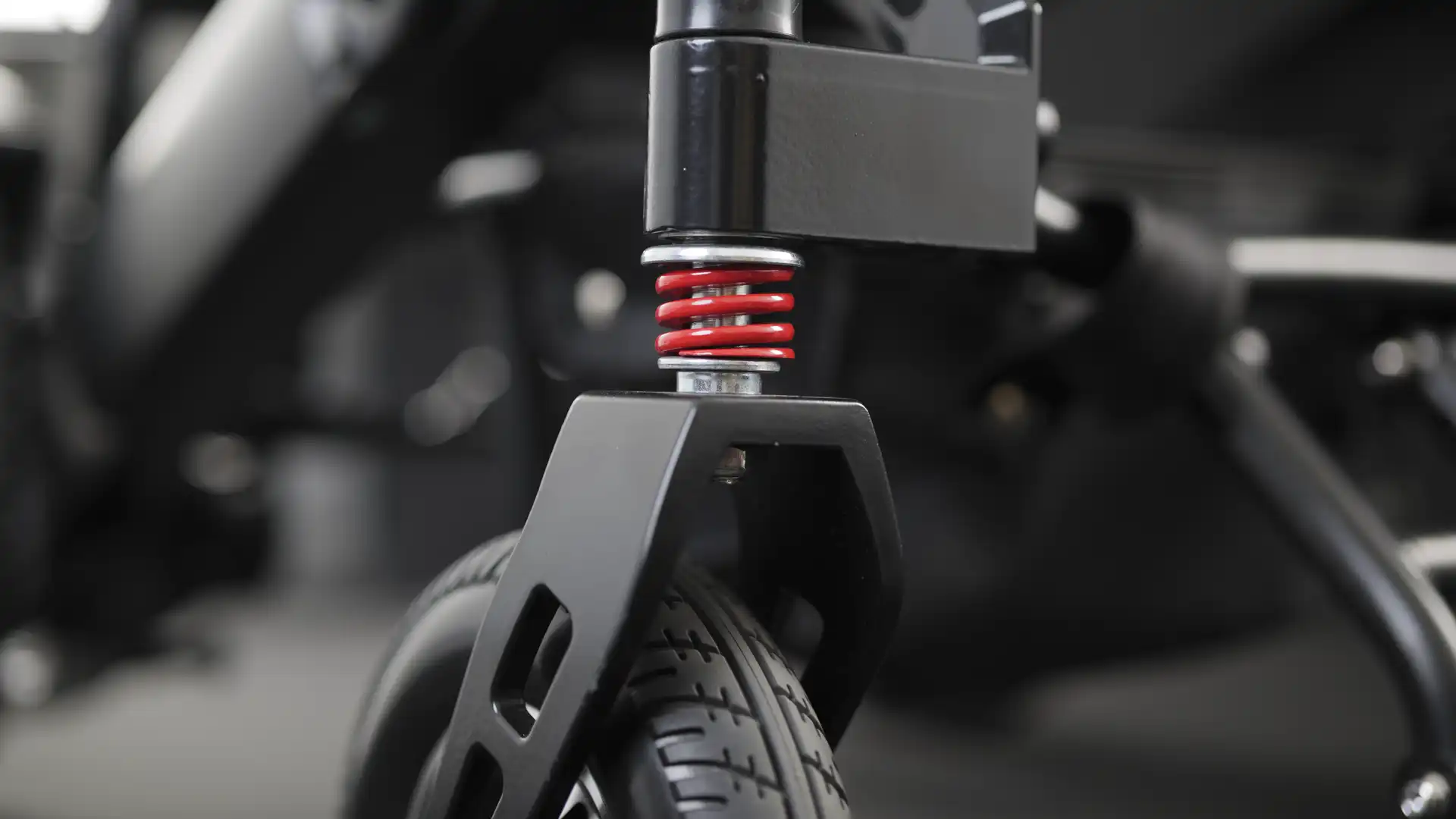 Suspension system with front and rear shocks absorbs bumps and smooths uneven surfaces. The suspension configuration enhances ride comfort across varied terrain types and reduces impact from kerbs and obstacles.