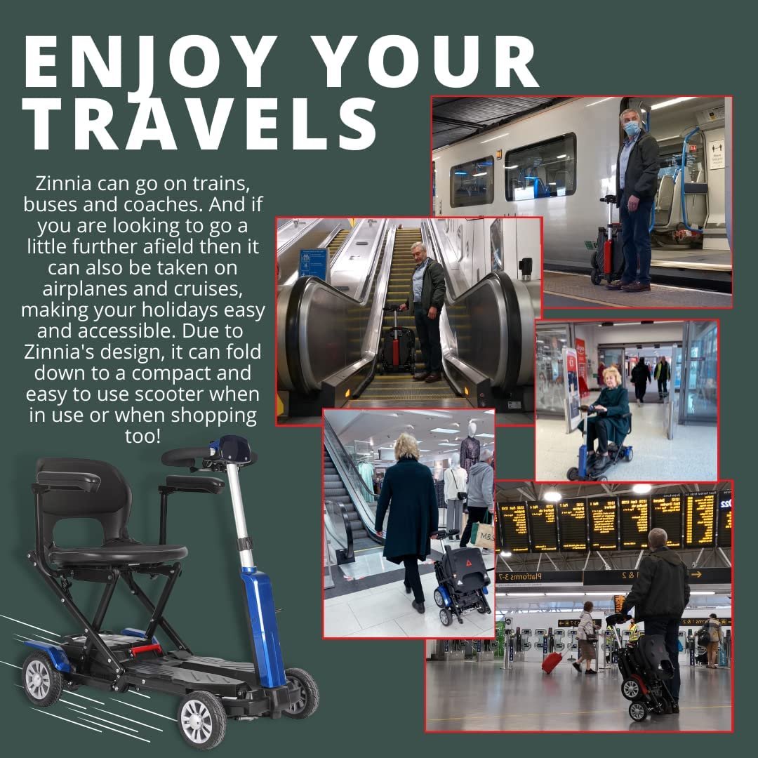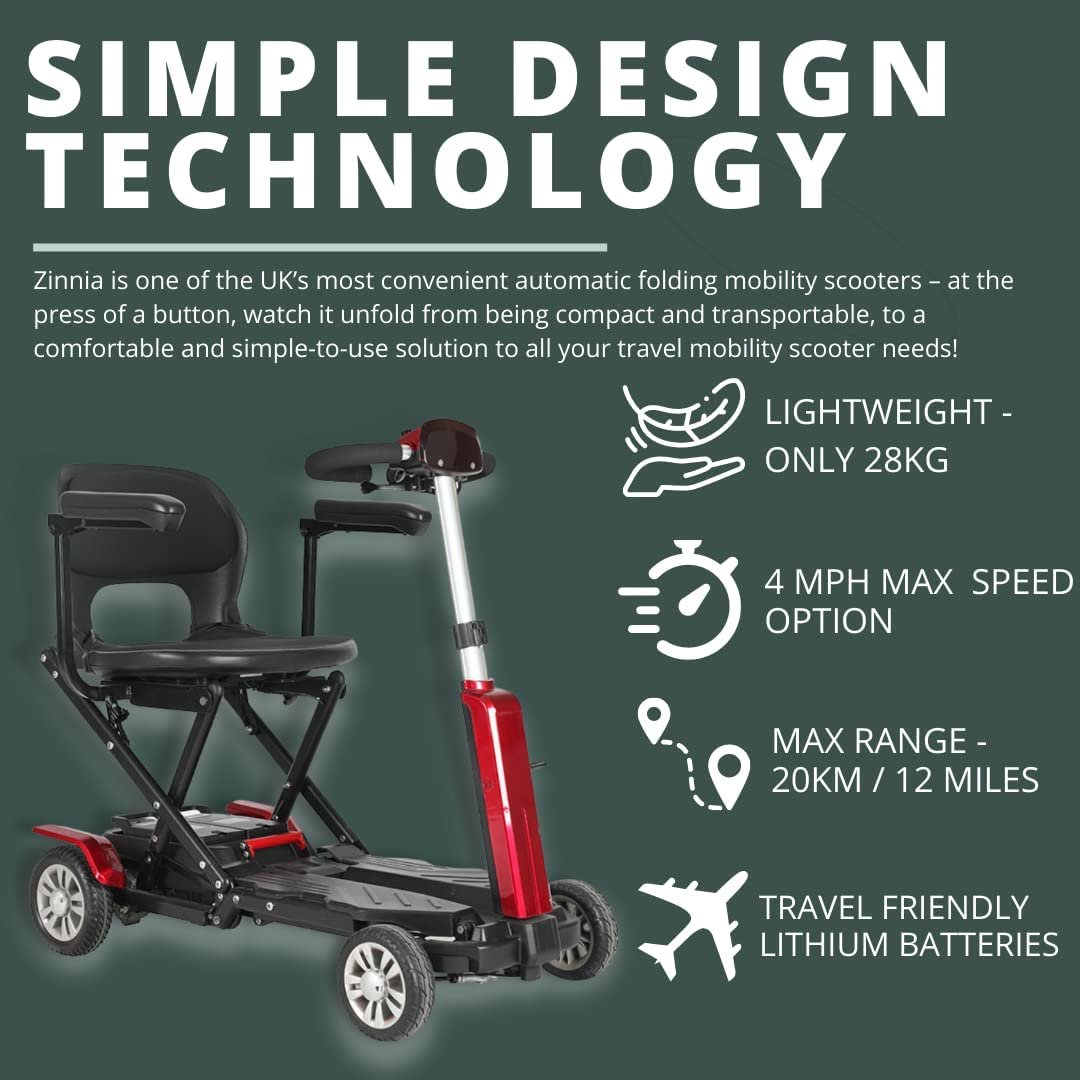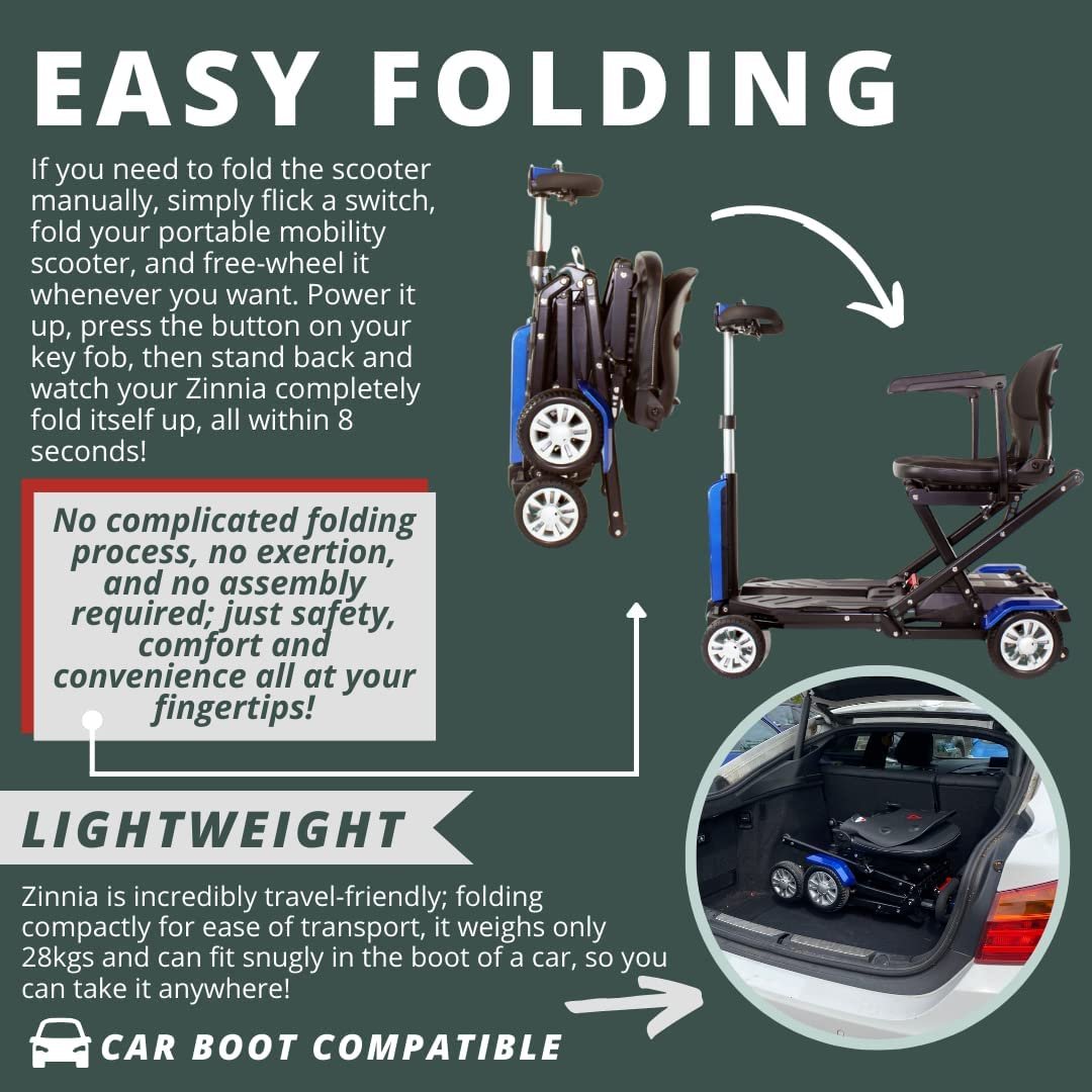 Zinnia is one of the UK’s most convenient automatic folding mobility scooters – at the press of a button, watch it unfold from being compact and transportable, to a comfortable and simple-to-use solution to all your travel mobility scooter needs! With all our folding mobility scooters, we prioritise 3 things: